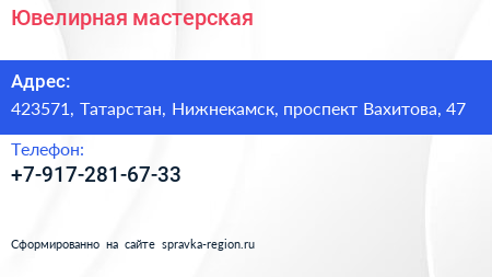 Ювелирная мастерская по адресу 423571, Татарстан, Нижнекамск, проспект Вахитова, 47 в дальнейшем Организация, размещена в следующих категориях: