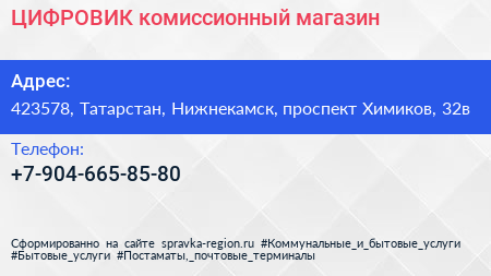 ЦИФРОВИК, комиссионный магазин по адресу 423578, Татарстан, Нижнекамск, проспект Химиков, 32в в дальнейшем Организация, размещена в следующих категориях: