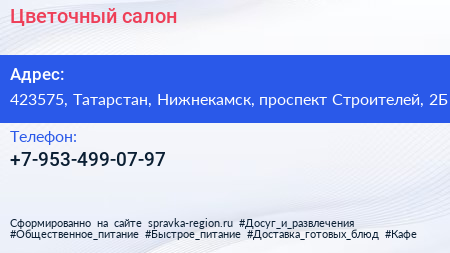 Цветочный салон по адресу 423575, Татарстан, Нижнекамск, проспект Строителей, 2Б в дальнейшем Организация, размещена в следующих категориях: