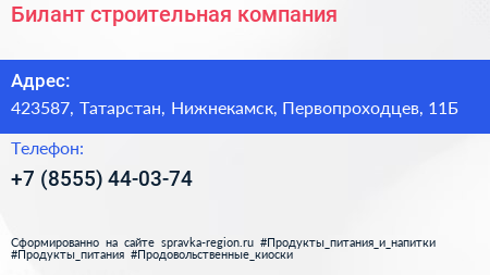 Билант, строительная компания по адресу 423587, Татарстан, Нижнекамск, Первопроходцев, 11Б в дальнейшем Организация, размещена в следующих категориях: