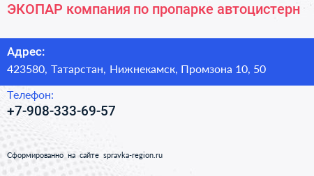 ЭКОПАР, компания по пропарке автоцистерн по адресу 423580, Татарстан, Нижнекамск, Промзона 10, 50 в дальнейшем Организация, размещена в следующих категориях: