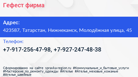 Гефест, фирма по адресу 423587, Татарстан, Нижнекамск, Молодёжная улица, 45 в дальнейшем Организация, размещена в следующих категориях: