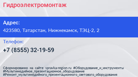 Гидроэлектромонтаж по адресу 423580, Татарстан, Нижнекамск, ТЭЦ-2, 2 в дальнейшем Организация, размещена в следующих категориях: