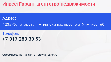 ИнвестГарант, агентство недвижимости по адресу 423575, Татарстан, Нижнекамск, проспект Химиков, 60 в дальнейшем Организация, размещена в следующих категориях: