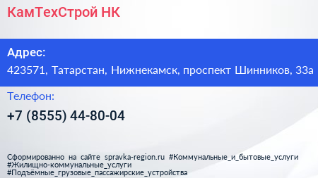 КамТехСтрой-НК по адресу 423571, Татарстан, Нижнекамск, проспект Шинников, 33а в дальнейшем Организация, размещена в следующих категориях: