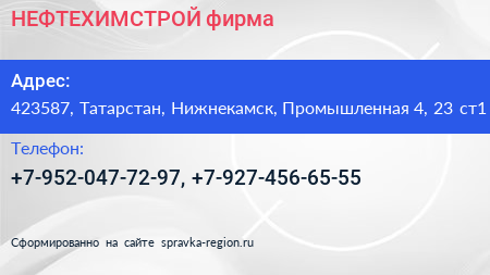 НЕФТЕХИМСТРОЙ, фирма по адресу 423587, Татарстан, Нижнекамск, Промышленная 4, 23 ст1 в дальнейшем Организация, размещена в следующих категориях: