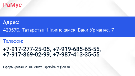 РаМус по адресу 423570, Татарстан, Нижнекамск, Баки Урманче, 7 в дальнейшем Организация, размещена в следующих категориях: