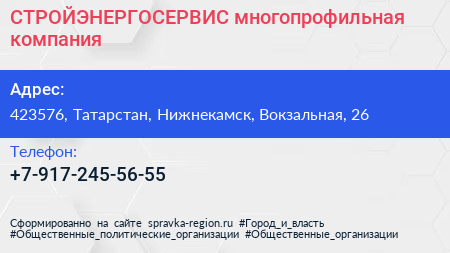 СТРОЙЭНЕРГОСЕРВИС, многопрофильная компания по адресу 423576, Татарстан, Нижнекамск, Вокзальная, 26 в дальнейшем Организация, размещена в следующих категориях: