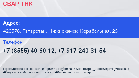 СВАР ТНК по адресу 423578, Татарстан, Нижнекамск, Корабельная, 25 в дальнейшем Организация, размещена в следующих категориях:
