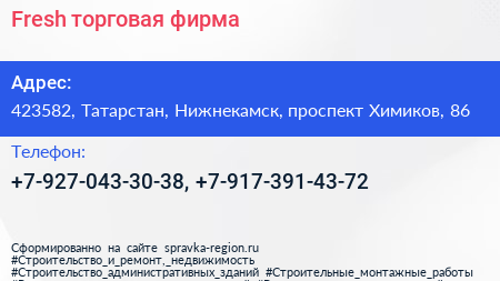 Fresh, торговая фирма по адресу 423582, Татарстан, Нижнекамск, проспект Химиков, 86 в дальнейшем Организация, размещена в следующих категориях: