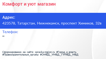 Комфорт и уют, магазин по адресу 423578, Татарстан, Нижнекамск, проспект Химиков, 32в в дальнейшем Организация, размещена в следующих категориях: