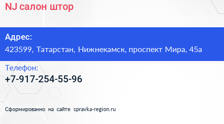 NJ, салон штор по адресу 423599, Татарстан, Нижнекамск, проспект Мира, 45а в дальнейшем Организация, размещена в следующих категориях: