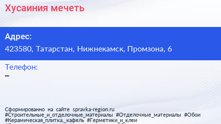 Хусаиния, мечеть по адресу 423580, Татарстан, Нижнекамск, Промзона, 6 в дальнейшем Организация, размещена в следующих категориях: