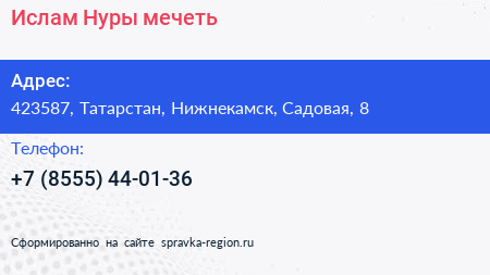 Ислам Нуры, мечеть по адресу 423587, Татарстан, Нижнекамск, Садовая, 8 в дальнейшем Организация, размещена в следующих категориях: