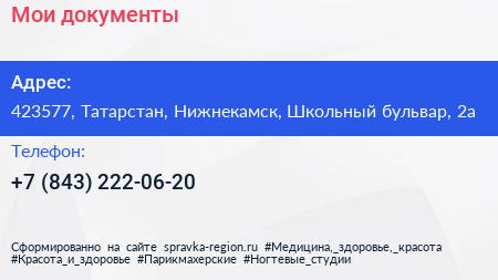 Мои документы по адресу 423577, Татарстан, Нижнекамск, Школьный бульвар, 2а в дальнейшем Организация, размещена в следующих категориях: