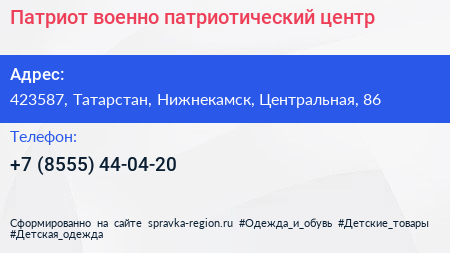 Патриот, военно-патриотический центр по адресу 423587, Татарстан, Нижнекамск, Центральная, 86 в дальнейшем Организация, размещена в следующих категориях: