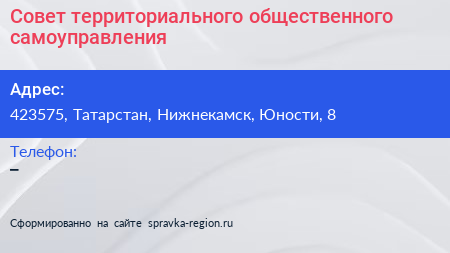 Совет территориального общественного самоуправления по адресу 423575, Татарстан, Нижнекамск, Юности, 8 в дальнейшем Организация, размещена в следующих категориях: