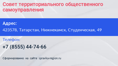 Совет территориального общественного самоуправления по адресу 423578, Татарстан, Нижнекамск, Студенческая, 49 в дальнейшем Организация, размещена в следующих категориях: