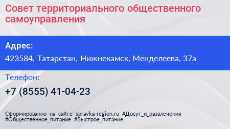 Совет территориального общественного самоуправления по адресу 423584, Татарстан, Нижнекамск, Менделеева, 37а в дальнейшем Организация, размещена в следующих категориях: