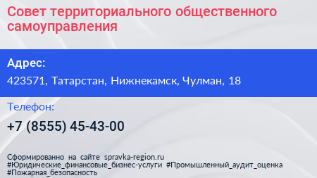 Совет территориального общественного самоуправления по адресу 423571, Татарстан, Нижнекамск, Чулман, 18 в дальнейшем Организация, размещена в следующих категориях: