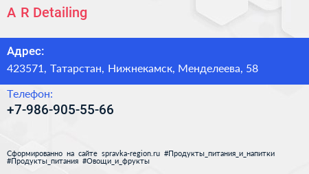 A & R Detailing по адресу 423571, Татарстан, Нижнекамск, Менделеева, 58 в дальнейшем Организация, размещена в следующих категориях: