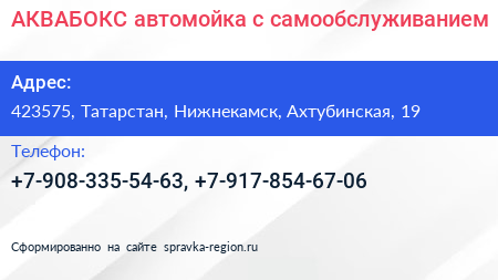 АКВАБОКС, автомойка c самообслуживанием по адресу 423575, Татарстан, Нижнекамск, Ахтубинская, 19 в дальнейшем Организация, размещена в следующих категориях: