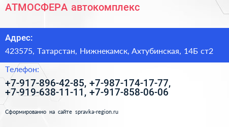 АТМОСФЕРА, автокомплекс по адресу 423575, Татарстан, Нижнекамск, Ахтубинская, 14Б ст2 в дальнейшем Организация, размещена в следующих категориях: