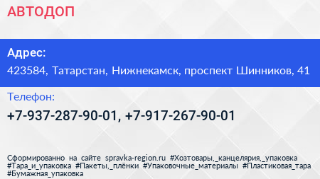 АВТОДОП по адресу 423584, Татарстан, Нижнекамск, проспект Шинников, 41 в дальнейшем Организация, размещена в следующих категориях: