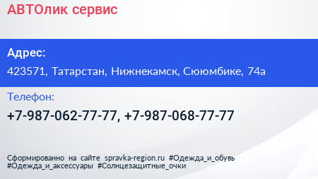 АВТОлик сервис по адресу 423571, Татарстан, Нижнекамск, Сююмбике, 74а в дальнейшем Организация, размещена в следующих категориях:
