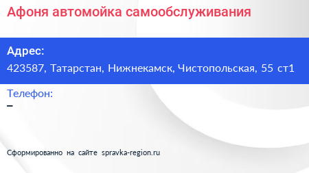 Афоня, автомойка самообслуживания по адресу 423587, Татарстан, Нижнекамск, Чистопольская, 55 ст1 в дальнейшем Организация, размещена в следующих категориях: