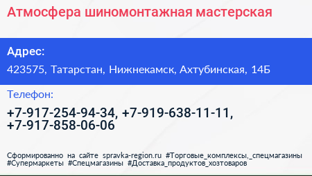 Атмосфера, шиномонтажная мастерская по адресу 423575, Татарстан, Нижнекамск, Ахтубинская, 14Б в дальнейшем Организация, размещена в следующих категориях:
