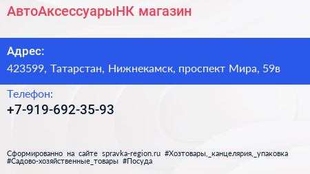 АвтоАксессуарыНК, магазин по адресу 423599, Татарстан, Нижнекамск, проспект Мира, 59в в дальнейшем Организация, размещена в следующих категориях: