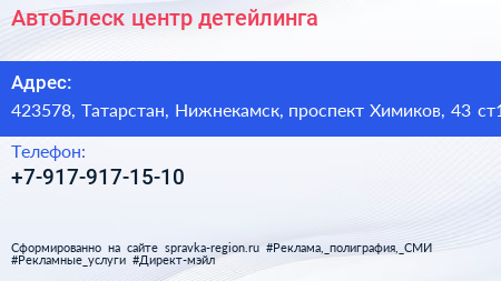 АвтоБлеск, центр детейлинга по адресу 423578, Татарстан, Нижнекамск, проспект Химиков, 43 ст1 в дальнейшем Организация, размещена в следующих категориях: