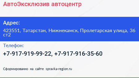 АвтоЭксклюзив, автоцентр по адресу 423551, Татарстан, Нижнекамск, Пролетарская улица, 36 ст2 в дальнейшем Организация, размещена в следующих категориях: