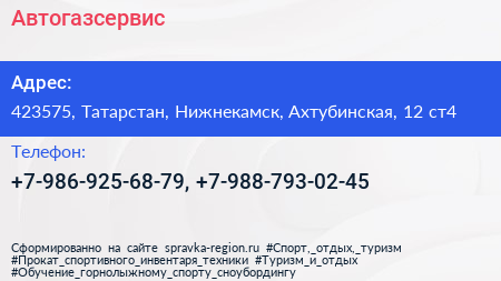 Автогазсервис по адресу 423575, Татарстан, Нижнекамск, Ахтубинская, 12 ст4 в дальнейшем Организация, размещена в следующих категориях: