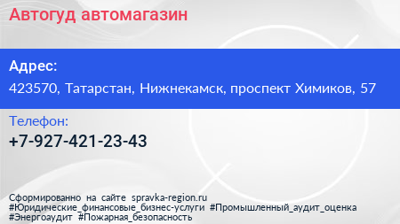 Автогуд, автомагазин по адресу 423570, Татарстан, Нижнекамск, проспект Химиков, 57 в дальнейшем Организация, размещена в следующих категориях:
