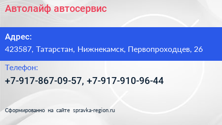 Автолайф, автосервис по адресу 423587, Татарстан, Нижнекамск, Первопроходцев, 26 в дальнейшем Организация, размещена в следующих категориях:
