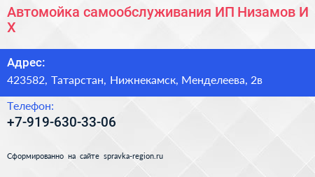Автомойка самообслуживания, ИП Низамов И.Х. по адресу 423582, Татарстан, Нижнекамск, Менделеева, 2в в дальнейшем Организация, размещена в следующих категориях: