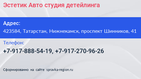 Эстетик Авто, студия детейлинга по адресу 423584, Татарстан, Нижнекамск, проспект Шинников, 41 в дальнейшем Организация, размещена в следующих категориях: