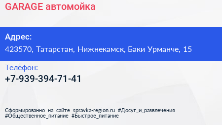 GARAGE, автомойка по адресу 423570, Татарстан, Нижнекамск, Баки Урманче, 15 в дальнейшем Организация, размещена в следующих категориях: