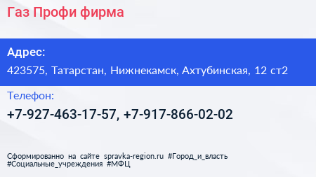Газ Профи, фирма по адресу 423575, Татарстан, Нижнекамск, Ахтубинская, 12 ст2 в дальнейшем Организация, размещена в следующих категориях: