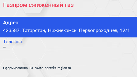 Газпром сжиженный газ по адресу 423587, Татарстан, Нижнекамск, Первопроходцев, 19/1 в дальнейшем Организация, размещена в следующих категориях: