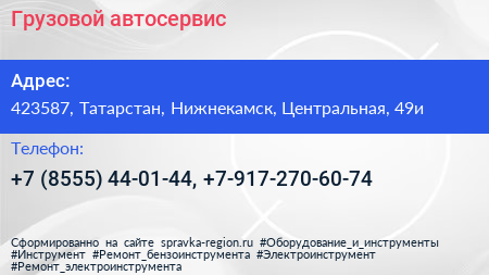 Грузовой автосервис по адресу 423587, Татарстан, Нижнекамск, Центральная, 49и в дальнейшем Организация, размещена в следующих категориях: