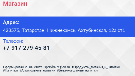 Магазин по адресу 423575, Татарстан, Нижнекамск, Ахтубинская, 12а ст1 в дальнейшем Организация, размещена в следующих категориях: