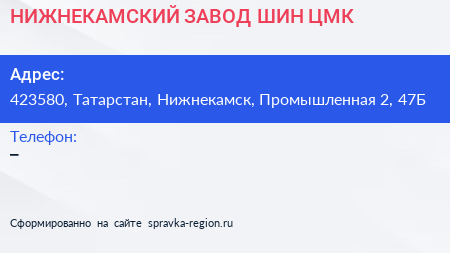 НИЖНЕКАМСКИЙ ЗАВОД ШИН ЦМК по адресу 423580, Татарстан, Нижнекамск, Промышленная 2, 47Б в дальнейшем Организация, размещена в следующих категориях: