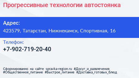 Прогрессивные технологии, автостоянка по адресу 423579, Татарстан, Нижнекамск, Спортивная, 16 в дальнейшем Организация, размещена в следующих категориях:
