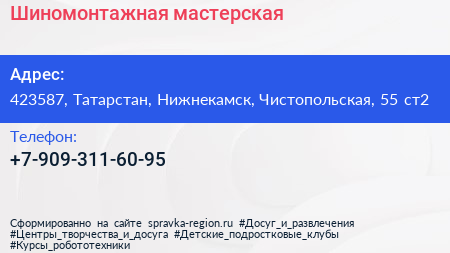 Шиномонтажная мастерская по адресу 423587, Татарстан, Нижнекамск, Чистопольская, 55 ст2 в дальнейшем Организация, размещена в следующих категориях: