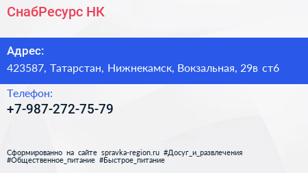 СнабРесурс-НК по адресу 423587, Татарстан, Нижнекамск, Вокзальная, 29в ст6 в дальнейшем Организация, размещена в следующих категориях: