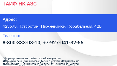 ТАИФ-НК АЗС по адресу 423578, Татарстан, Нижнекамск, Корабельная, 42Б в дальнейшем Организация, размещена в следующих категориях: