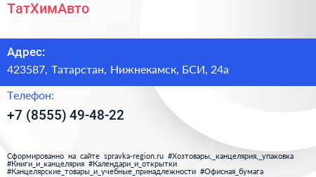 ТатХимАвто по адресу 423587, Татарстан, Нижнекамск, БСИ, 24а в дальнейшем Организация, размещена в следующих категориях: